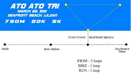 Organizers John Dandan and Dindz Bartolabac invites everyone to join the "ATO-ATO Tri sa Lilo-an" (750 Swim - 20km Bike - 5km Run) on March 26, 2011 (Sat), 9:00am at Seafront Beach, Lilo-an, Cebu. The organizers said that this event is all for the sake of having fun, fellowship, training and enjoying the sport of triathlon. There will be no marshals so safety first should be everybody's priority.